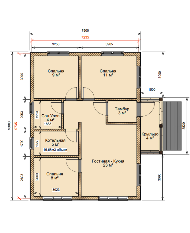 • Отделка наружных стен 1-го этажа: ОСП 9 мм